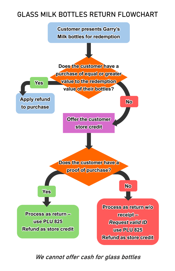 Flowchart provided to staff to help them with a complicated policy change regarding cash and glass milk bottles