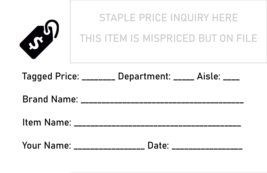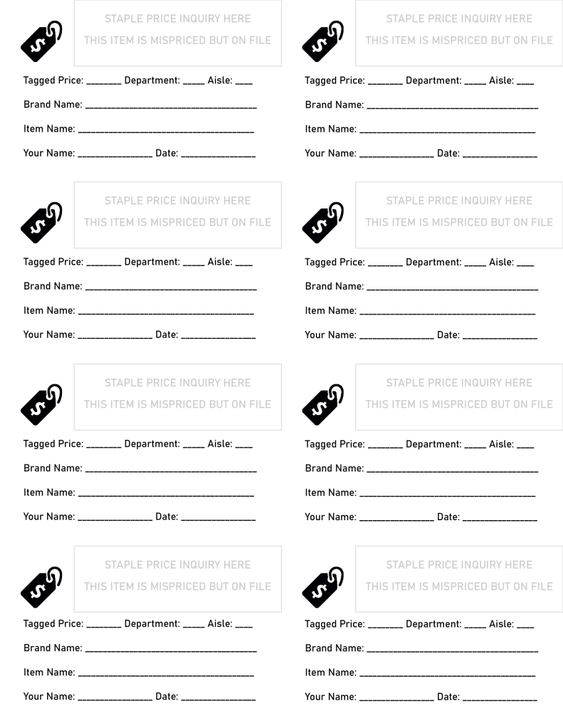 1/2 – Slips designed to be printed on an “8up” piece of perforated card stock, used for inventory that had an erroneous price but was still in the system