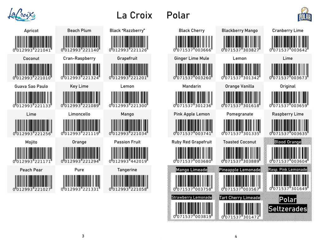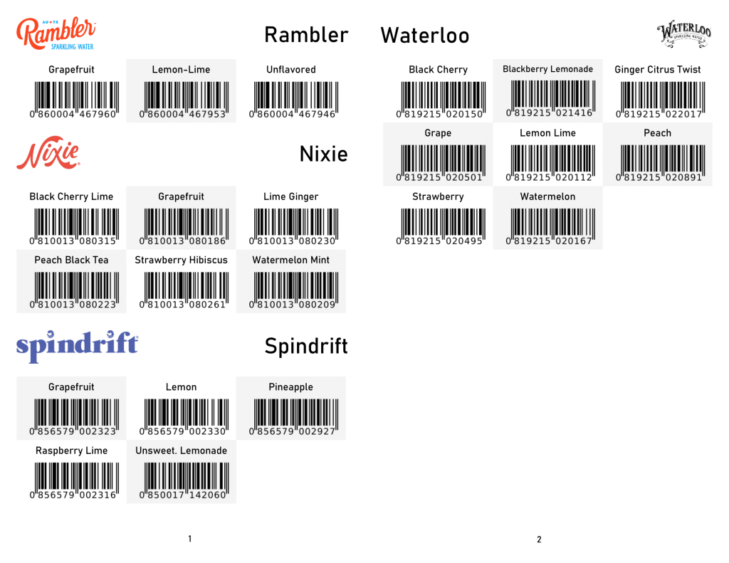 1/2 – Custom scan pages for the many 8-pack sparkling waters sold at the store, designed to help give the grocery department accurate inventory data